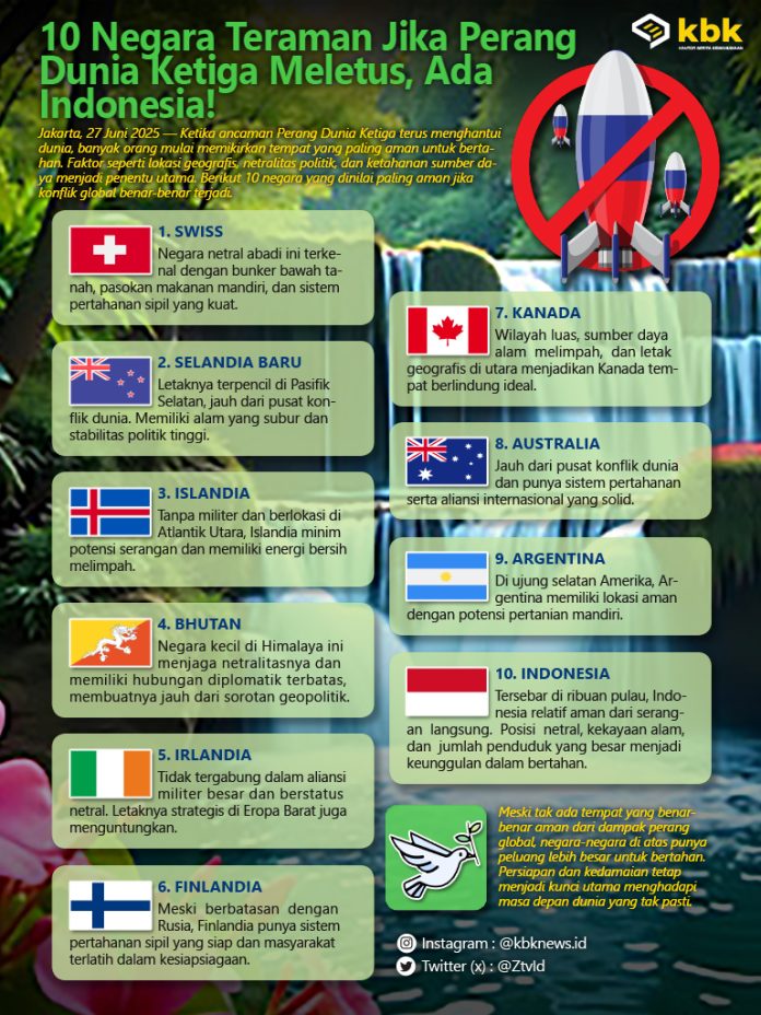 Infografis 10 Negara Teraman Jika Perang Dunia Ketiga Meletus, Ada Indonesia! By Aziz - June 27, 2025 FacebookTwitterPinterestWhatsApp Meski tak ada tempat yang benar-benar aman dari dampak perang global, negara- negara di atas punya peluang lebih besar untuk bertahan. Persiapan dan kedamaian tetap menjadi kunci utama menghadapi masa depan dunia yang tak pasti. Advertisement
