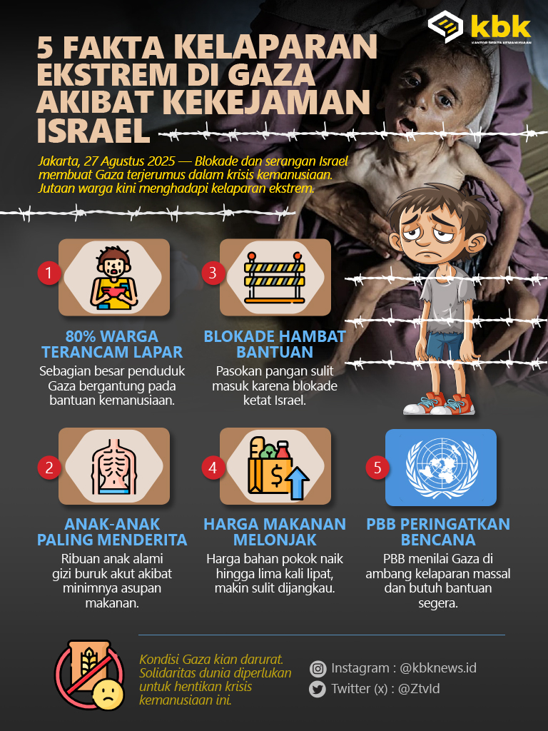 Infografis 5 Fakta Kelaparan Ekstrem di Gaza akibat Kekejaman Israel By Aziz - August 27, 2025 FacebookTwitterPinterestWhatsApp Krisis kelaparan di Gaza adalah tragedi kemanusiaan yang menuntut perhatian global. Dukungan dan aksi nyata dari masyarakat internasional sangat diperlukan agar penderitaan warga Gaza dapat segera diakhiri. Advertisement