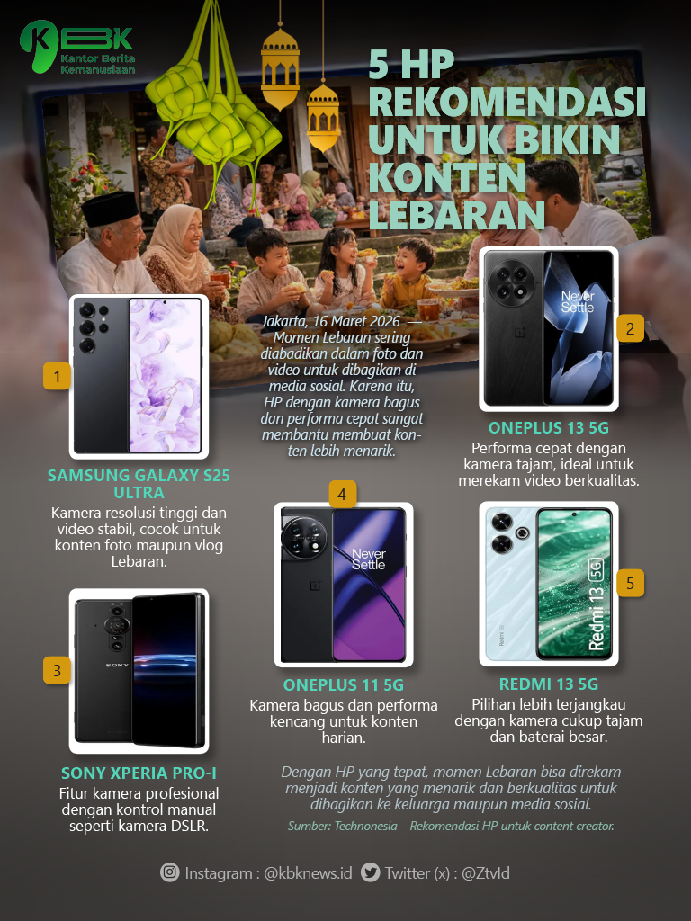 Infografis 5 HP Rekomendasi untuk Bikin Konten Lebaran By Aziz - March 16, 2026 FacebookTwitterPinterestWhatsApp Dengan HP yang tepat, momen Lebaran bisa direkam menjadi konten yang menarik dan berkualitas untuk dibagikan ke keluarga maupun media sosial. Advertisement