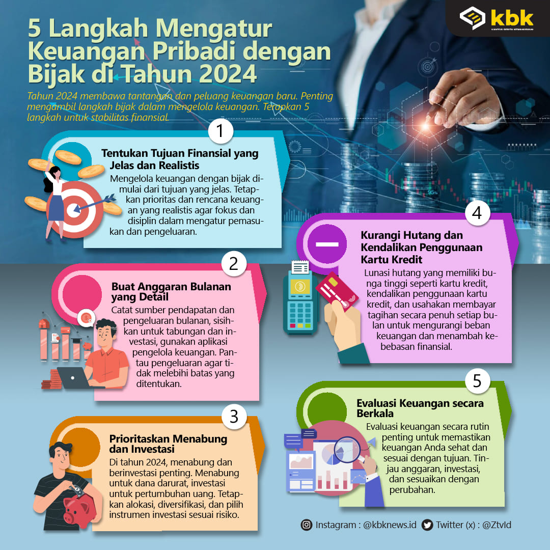 Infografis 5 Langkah Mengatur Keuangan Pribadi dengan Bijak di Tahun 2024 By Aziz - September 24, 2024 FacebookTwitterPinterestWhatsApp JAKARTA – Tahun 2024 membawa tantangan dan peluang keuangan baru. Penting mengambil langkah bijak dalam mengelola keuangan. Terapkan 5 langkah untuk stabilitas finansial. Advertisement