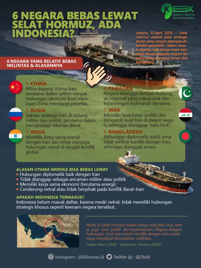 Infografis 6 Negara Bebas Lewat Selat Hormuz, Ada Indonesia? By Aziz - April 10, 2026 FacebookTwitterPinterestWhatsApp Akses di Selat Hormuz bukan hanya soal jalur laut, tetapi juga soal politik dan kepercayaan. Negara dengan hubungan kuat dan minim konflik dengan Iran cenderung mendapat kemudahan melintas. Advertisement