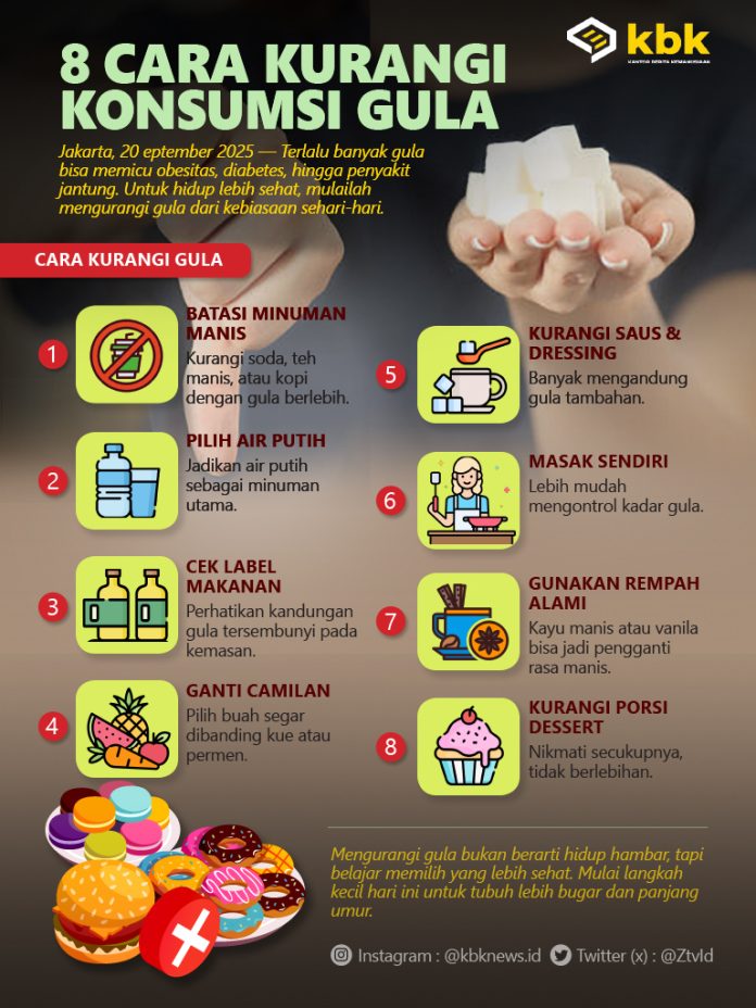 Infografis 8 Cara Kurangi Konsumsi Gula By Aziz - September 20, 2025 FacebookTwitterPinterestWhatsApp Mengurangi gula bukan berarti hidup hambar, tapi belajar memilih yang lebih sehat. Mulai langkah kecil hari ini untuk tubuh lebih bugar dan panjang umur. Advertisement