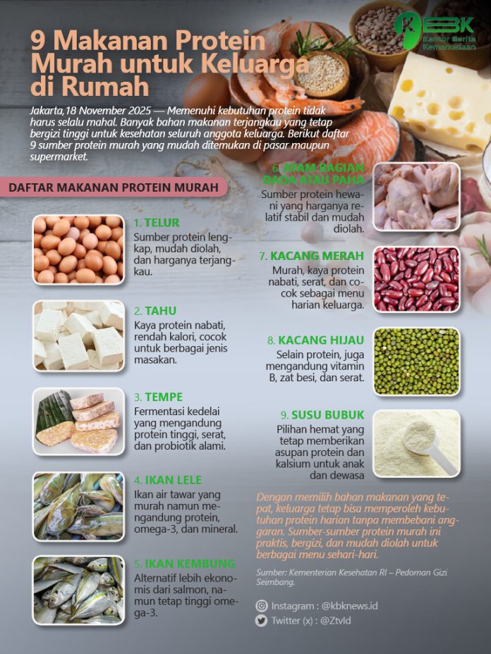 Infografis 9 Makanan Protein Murah untuk Keluarga di Rumah By Aziz - November 18, 2025 FacebookTwitterPinterestWhatsApp Dengan memilih bahan makanan yang tepat, keluarga tetap bisa memperoleh kebutuhan protein harian tanpa membebani anggaran. Sumber-sumber protein murah ini praktis, bergizi, dan mudah diolah untuk berbagai menu sehari-hari. Advertisement