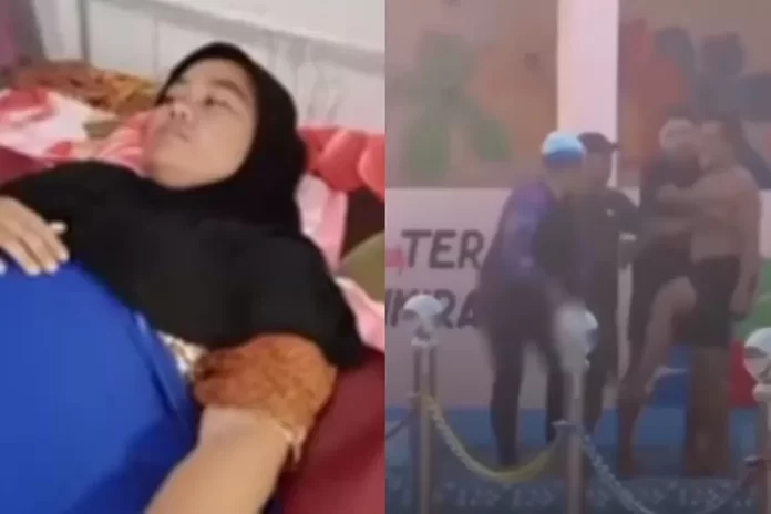 Penjaga kolam renang secara spontan menyelamatkan korban, sedangkan pengunjung kolam renang panik, berteriak minta tolong.