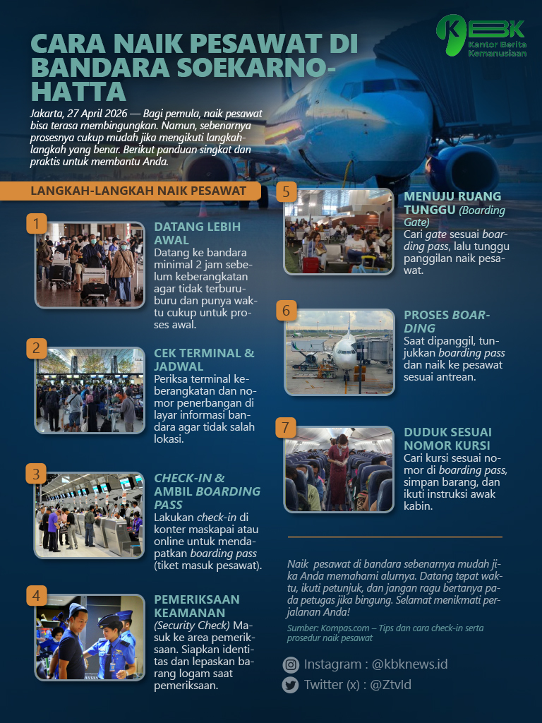 Infografis Cara Naik Pesawat di Bandara Soekarno-Hatta By Aziz - April 27, 2026 FacebookTwitterPinterestWhatsApp Naik pesawat di bandara sebenarnya mudah jika Anda memahami alurnya. Datang tepat waktu, ikuti petunjuk, dan jangan ragu bertanya pada petugas jika bingung. Selamat menikmati perjalanan Anda! Advertisement