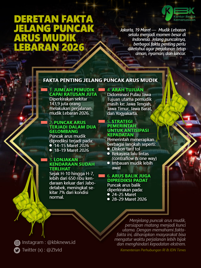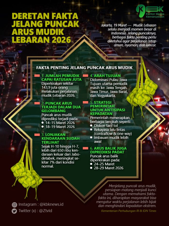 Infografis Deretan Fakta Jelang Puncak Arus Mudik Lebaran 2026 By Aziz - March 19, 2026 FacebookTwitterPinterestWhatsApp Menjelang puncak arus mudik, persiapan matang menjadi kunci utama. Dengan memahami fakta-fakta ini, diharapkan masyarakat bisa mengatur waktu perjalanan lebih bijak dan menghindari kepadatan ekstrem. Advertisement