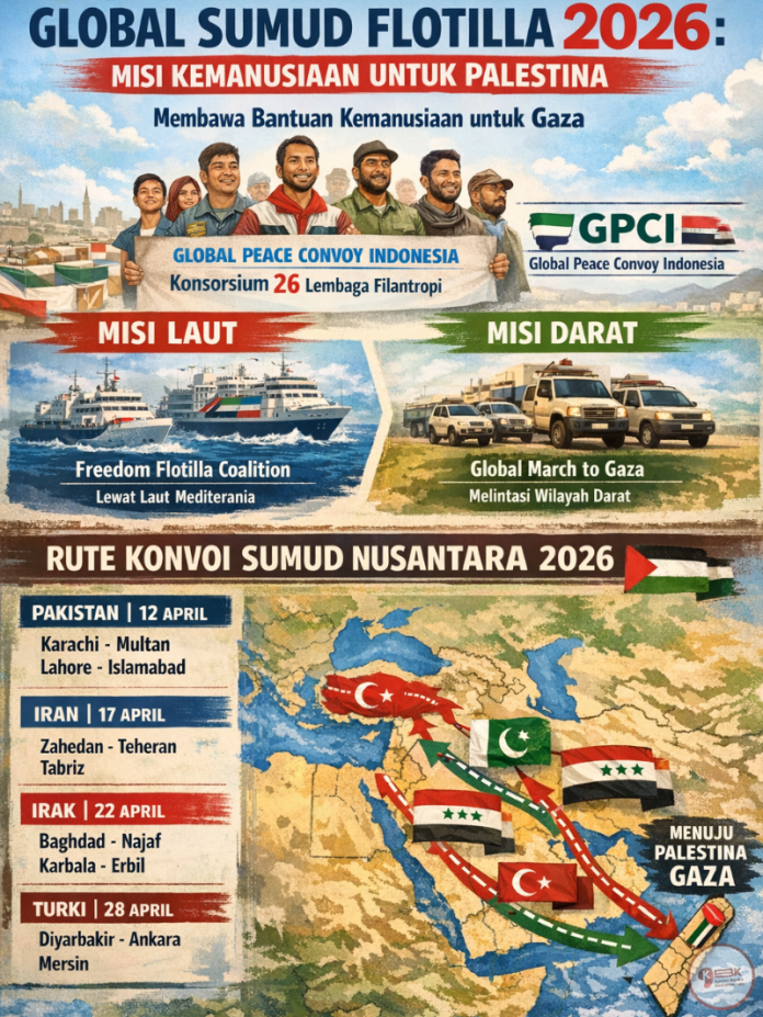 Aktivis Indonesia turut ambil bagian dalam misi kemanusiaan Global Sumud Flotilla (GSF) 2026, sebuah konvoi internasional besar yang dirancang melalui dua jalur, yakni laut dan darat. Misi ini menargetkan lebih dari 10 ribu relawan dari sekitar 100 negara untuk membawa ribuan ton bantuan kemanusiaan bagi masyarakat Palestina di Jalur Gaza yang masih menghadapi blokade dan konflik berkepanjangan.