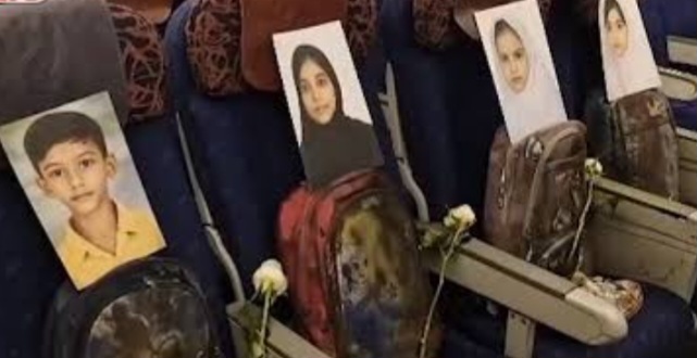 Ketua Parlemen Iran, Mohammad Bagher Ghalibaf, terlihat menatap foto-foto para siswa yang telah meninggal dunia. Foto-foto tersebut diletakkan di bangku kosong pesawat, disertai setangkai mawar putih dan tas milik para korban, menciptakan suasana penuh duka di dalam kabin.