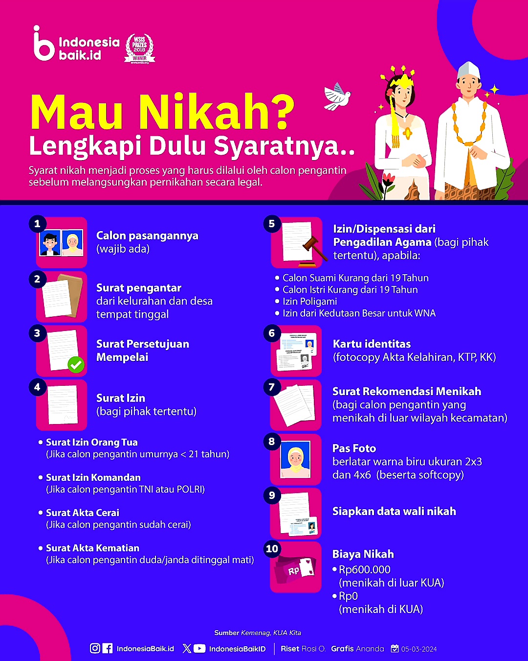Menurut informasi dari Kementerian Agama, berikut adalah beberapa dokumen yang harus dipersiapkan saat mendaftar pernikahan di Kantor Urusan Agama (KUA).