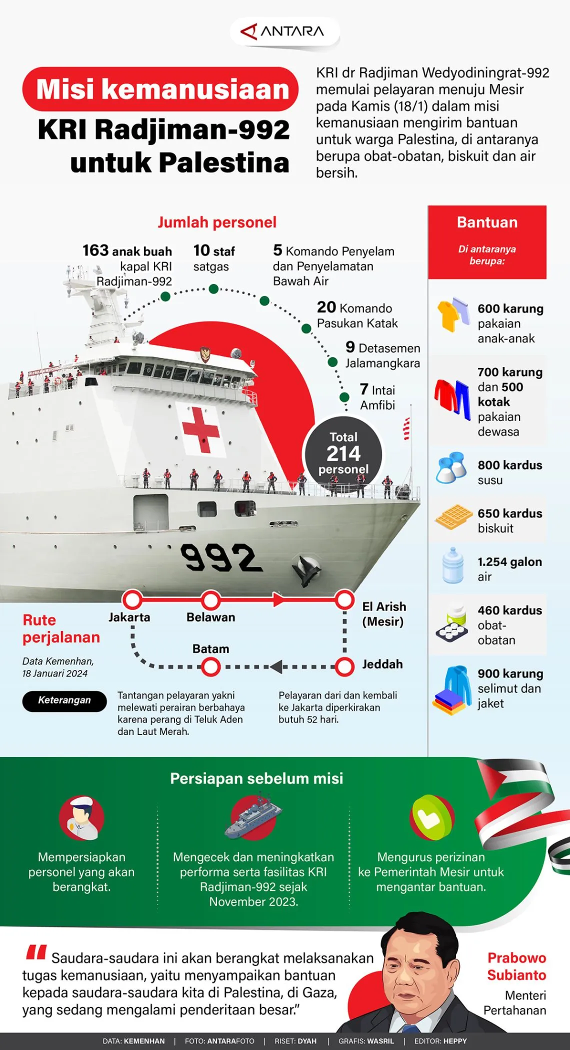 Infografis Misi Kemanusiaan KRI Radjiman-992 untuk Palestina By Agus Wahyudi - January 22, 2024 FacebookTwitterPinterestWhatsApp (Infografis: Antara) JAKARTA – KRI Radjiman Wedyodiningrat-992 memulai pelayaran menuju Mesir pada Kamis (18/1/2024) dalam misi kemanusiaan mengirim bantuan untuk warga Palestina, di antaranya berupa obat-obatan, biskuit dan air bersih. Advertisement