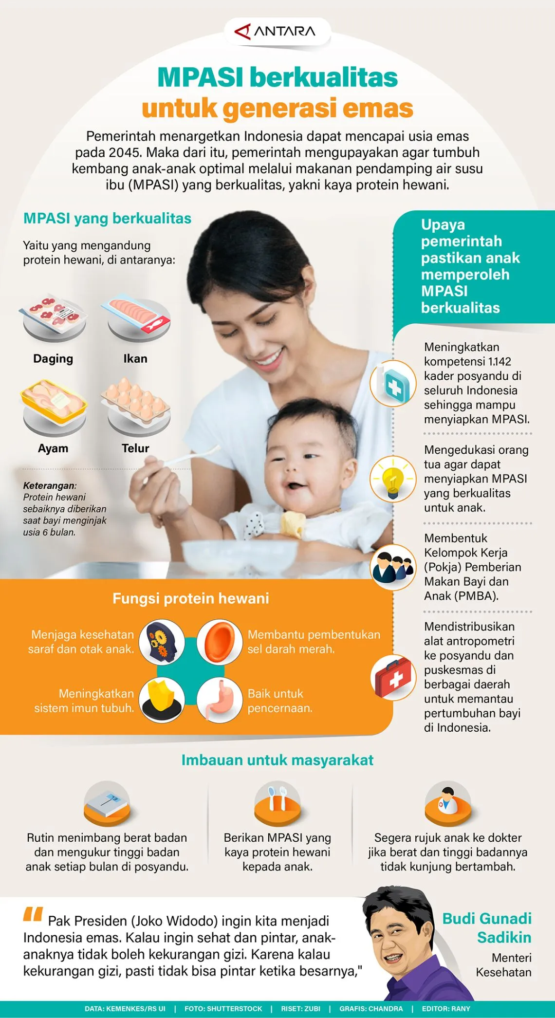 Infografis MPASI Berkualitas untuk Generasi Emas By Agus Wahyudi - February 4, 2024 FacebookTwitterPinterestWhatsApp (Infografis: Antara) JAKARTA – Pemerintah menargetkan Indonesia dapat mencapai usia emas pada 2045. Maka dari itu, pemerintah mengupayakan agar tumbuh kembang anak-anak optimal melalui Makanan Pendamping Air Susu Ibu (MPASI) yang berkualitas, yakni kaya protein hewani. Advertisement