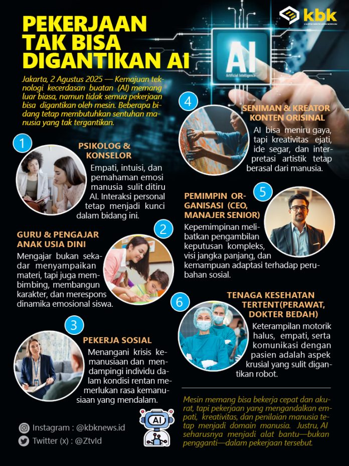 Infografis Pekerjaan Tak Bisa Digantikan AI By Aziz - August 2, 2025 FacebookTwitterPinterestWhatsApp Mesin memang bisa bekerja cepat dan akurat, tapi pekerjaan yang mengandalkan empati, kreativitas, dan penilaian manusia tetap menjadi domain manusia. Justru, AI seharusnya menjadi alat bantu bukan pengganti dalam pekerjaan tersebut. Advertisement