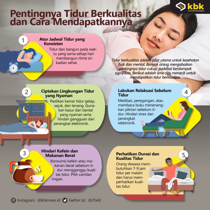 Infografis Pentingnya Tidur Berkualitas dan Cara Mendapatkannya By Aziz - January 16, 2025 FacebookTwitterPinterestWhatsApp Tidur berkualitas adalah pilar utama untuk kesehatan fisik dan mental. Banyak orang mengabaikan pentingnya tidur cukup, padahal berdampak signifikan. Berikut adalah lima tips menarik untuk mendapatkan tidur berkualitas. Advertisement