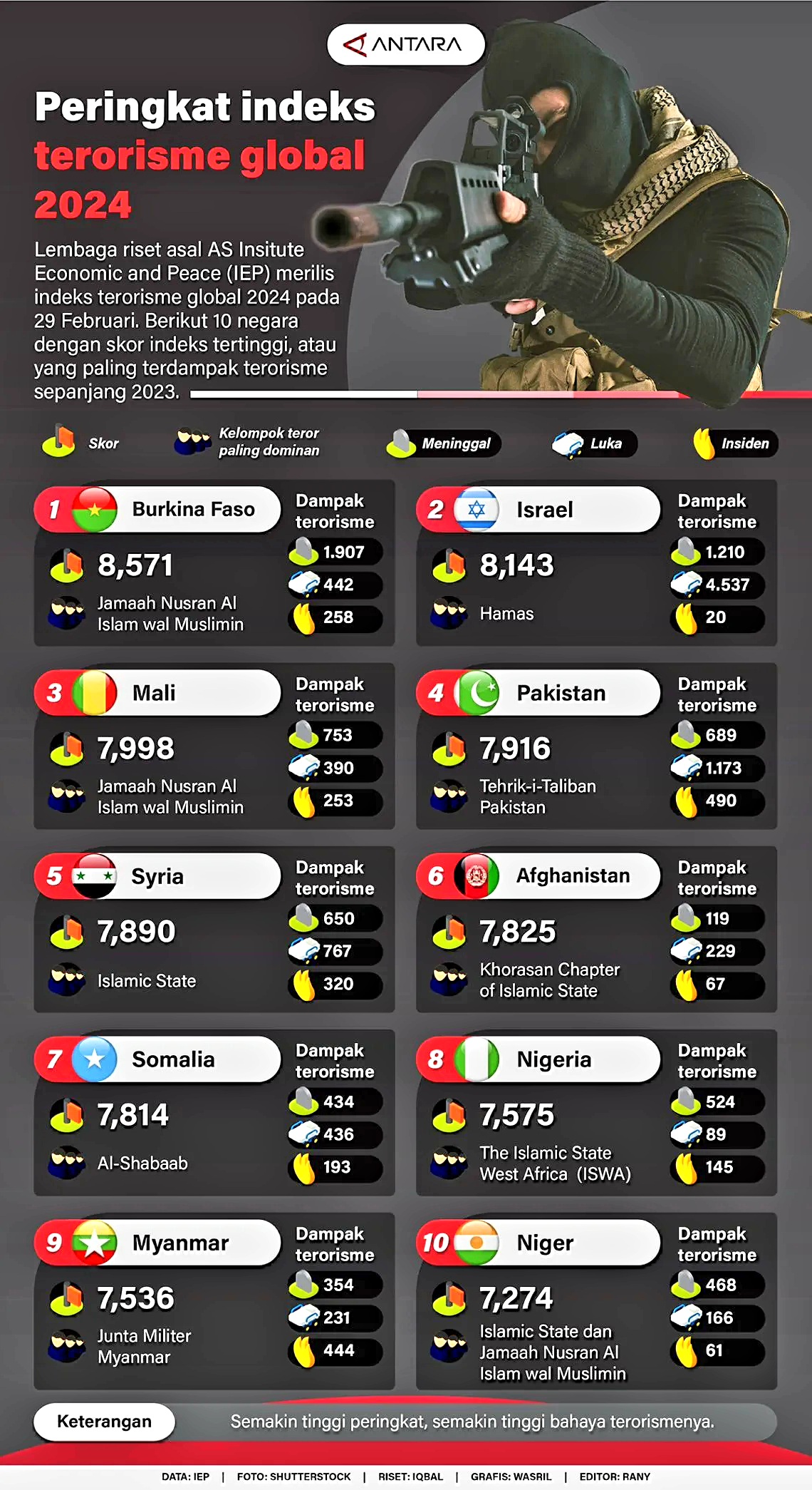 Infografis Peringkat Indeks Terorisme Global 2024 By Agus Wahyudi - March 9, 2024 FacebookTwitterPinterestWhatsApp (Infografis: Antara) JAKARTA – Lembaga riset asal AS Insitute Economic and Peace (IEP) merilis indeks terorisme global 2024 pada 29 Februari. Berikut 10 negara dengan skor indeks tertinggi, atau yang paling terdampak terorisme sepanjang 2023. Advertisement