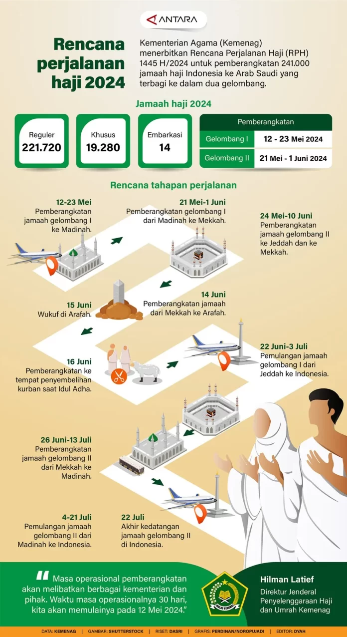 JAKARTA – Kementerian Agama (Kemenag) menerbitkan Rencana Perjalanan Haji (RPH) 1445 H/2024 untuk pemberangkatan 241.000 jamaah haji Indonesia ke Arab Saudi yang terbagi ke dalam dua gelombang.
