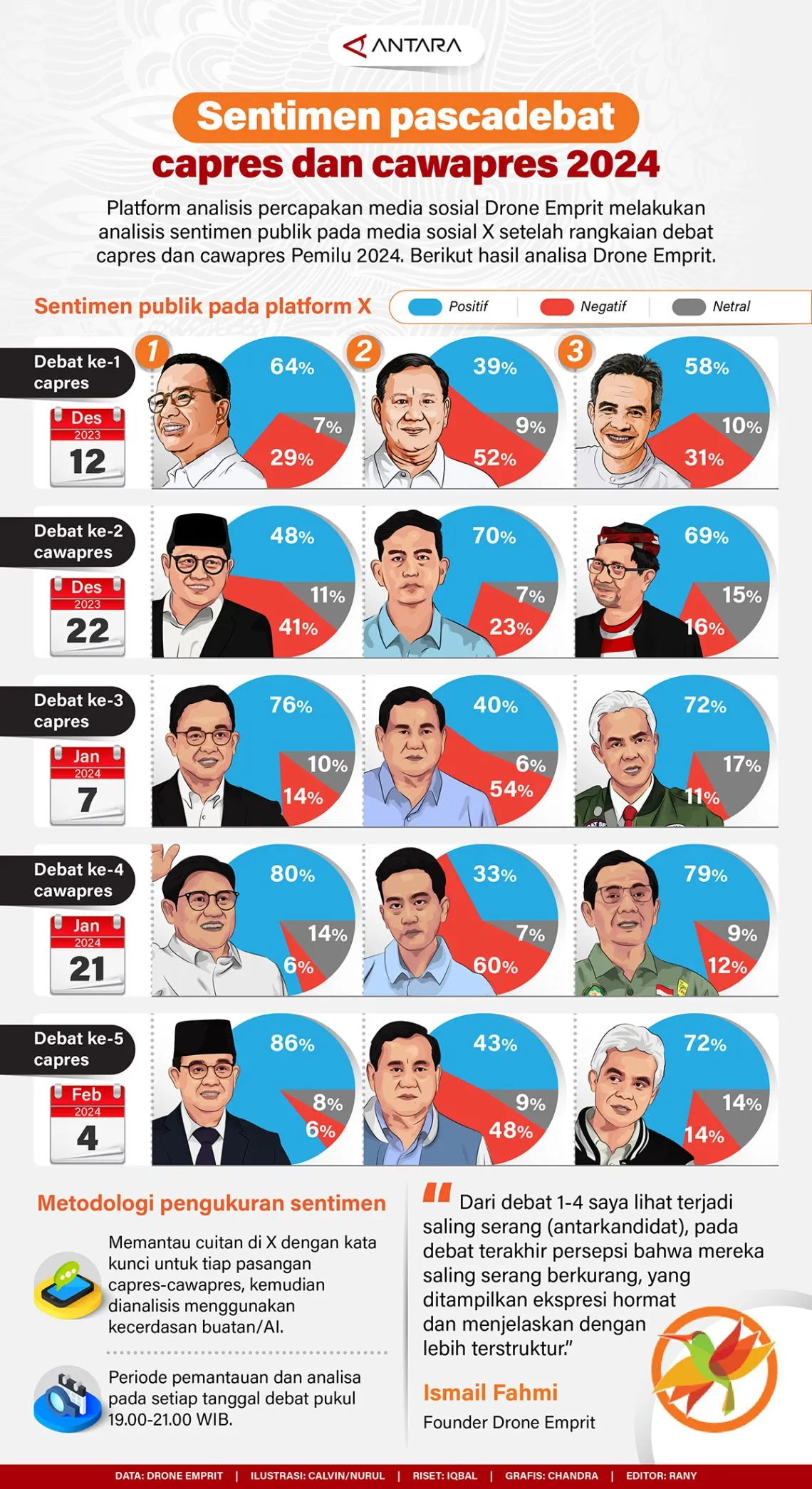 Infografis Sentimen Pascadebat Capres dan Cawapres 2024 By Agus Wahyudi - February 5, 2024 FacebookTwitterPinterestWhatsApp (Infografis: Antara) JAKARTA – Platform analisis percapakan media sosial Drone Emprit melakukan analisis sentimen publik pada media sosial X setelah rangkaian debat capres dan cawapres Pemilu 2024. Berikut hasil analisa Drone Emprit. Advertisement