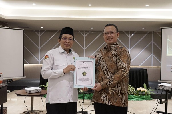 Penyerahan SK dilakukan langsung oleh Direktur Zakat dan Wakaf Kemenag RI, Waryono Abdul Ghofur, kepada Ketua Pengurus Dompet Dhuafa, Ahmad Juwaini.
