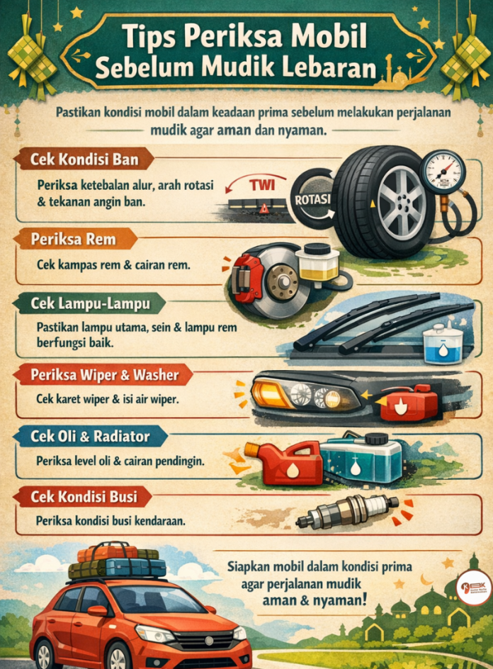 Namun sebelum menempuh perjalanan jauh, pemilik kendaraan disarankan untuk memastikan kondisi mobil dalam keadaan prima agar perjalanan tetap aman dan nyaman. Berikut ini beberapa tips yang dirangkum KBKNews, Senin (9/3/2026).