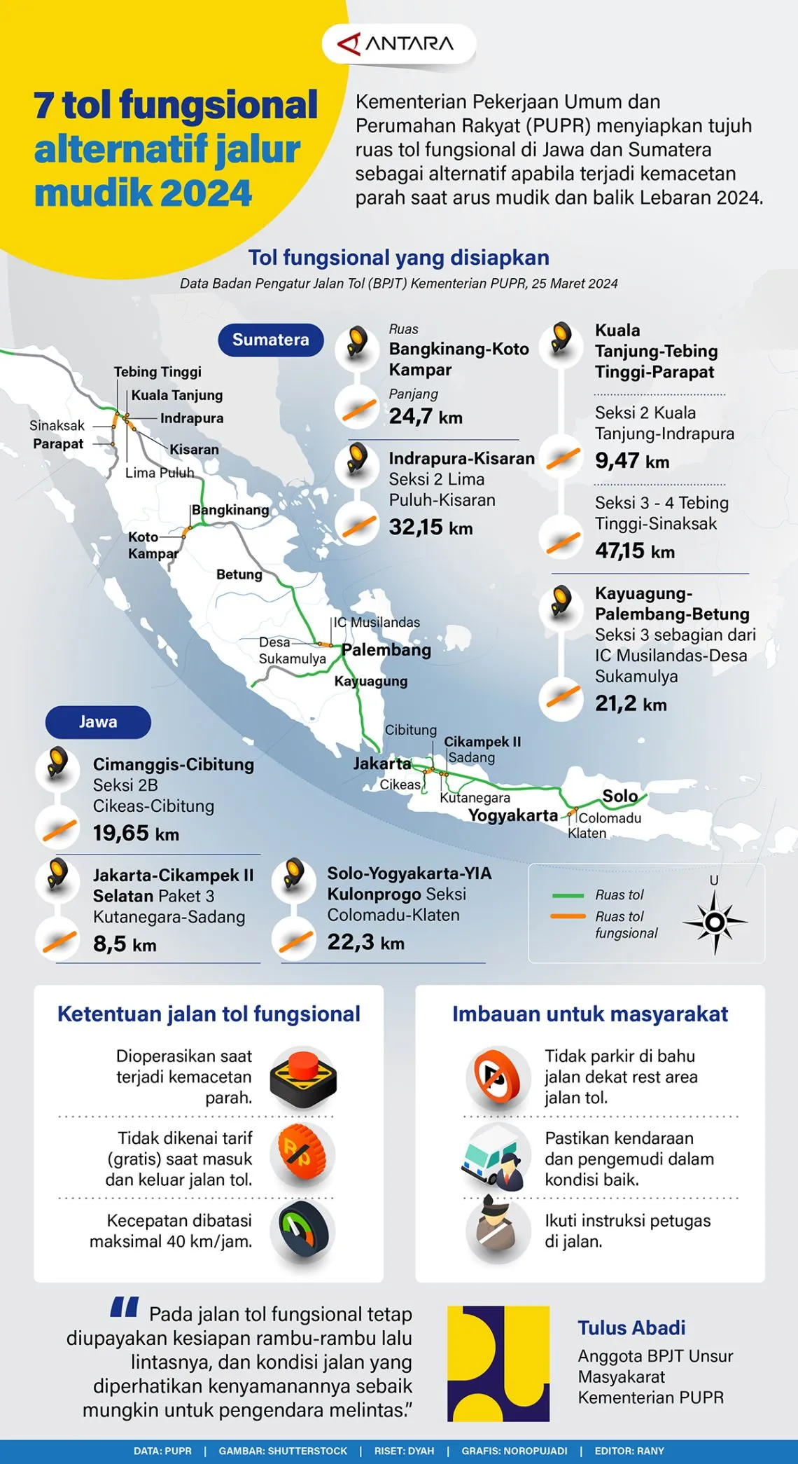 Infografis Tujuh Tol Fungsional Alternatif Jalur Mudik 2024 By Agus Wahyudi - March 31, 2024 FacebookTwitterPinterestWhatsApp (Infografis: Antara) JAKARTA – Kementerian Pekerjaan Umum dan Perumahan Rakyat (PUPR) menyiapkan tujuh ruas tol fungsional di Jawa dan Sumatera sebagai alternatif apabila terjadi kemacetan parah saat arus mudik dan balik Lebaran 2024. Advertisement